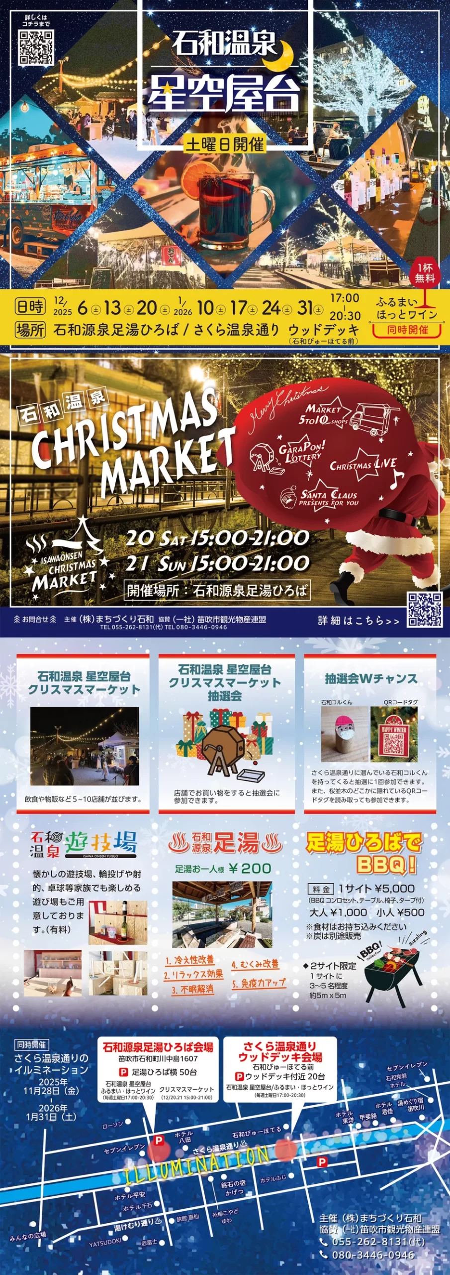 石和温泉の夜空にきらめく「星空屋台」と、心も温まる「クリスマスマーケット」が今年も登場! さくら温泉通りウッドデッキと足湯ひろばに、グルメや雑貨のお店がずらりと並びます。お買い物をすると抽選会に参加できるほか、さくら温泉通りアイテムやQRコードで“Wチャンス”も! さらに、懐かしの遊技場コーナーでは輪投げ・射的・卓球など、家族みんなで楽しめる遊びがいっぱい(有料)。 美味しいものを食べて、楽しい遊びで笑って、キラキラの夜を満喫しましょう。友達やご家族と一緒に、冬の思い出づくりにぜひお出かけください!